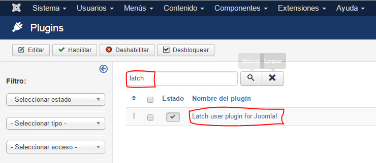 Ahora nos vamos otra vez a nuestro CMS, en este caso a «Extensiones» > «Plugins» > Buscamos «Latch»: