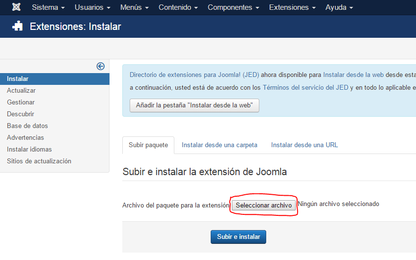 Subir el plugin que hemos descargado a nuestro CMS Joomla desde el Gestor de Extensiones:
